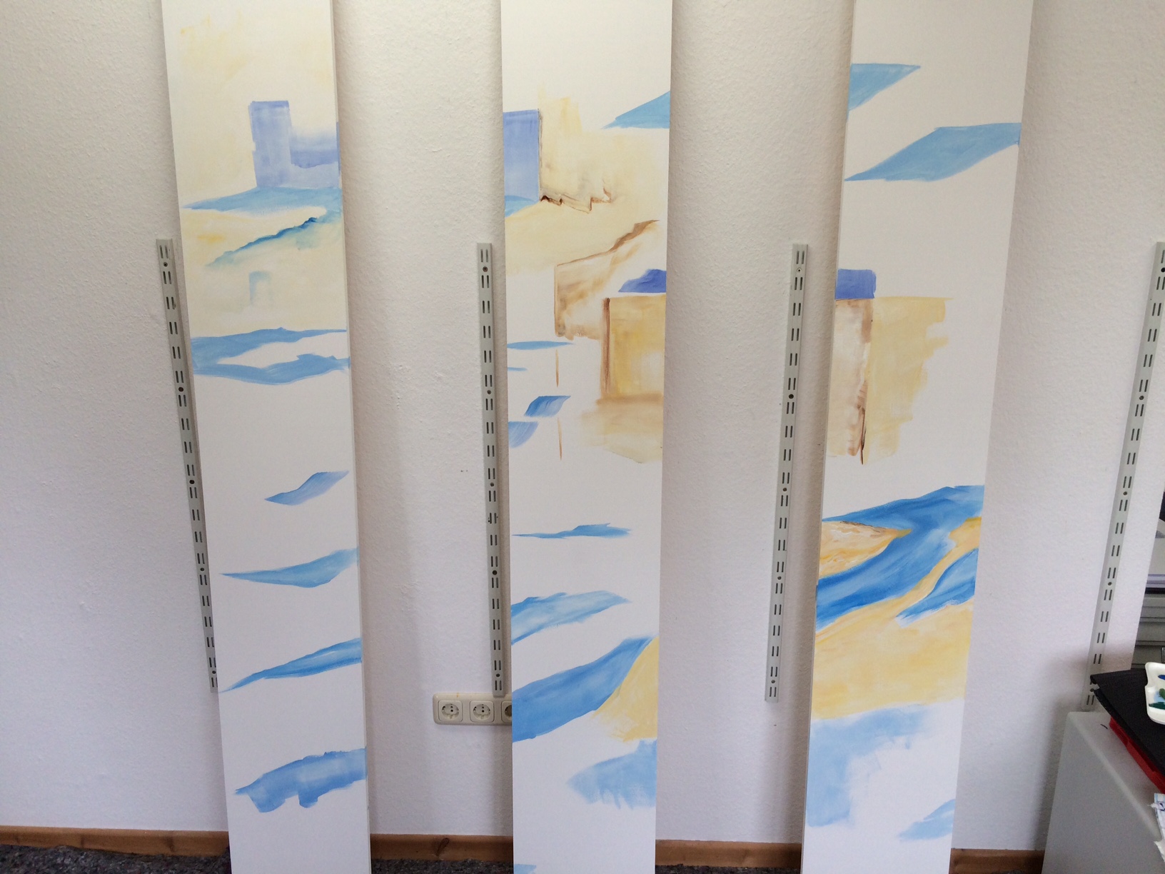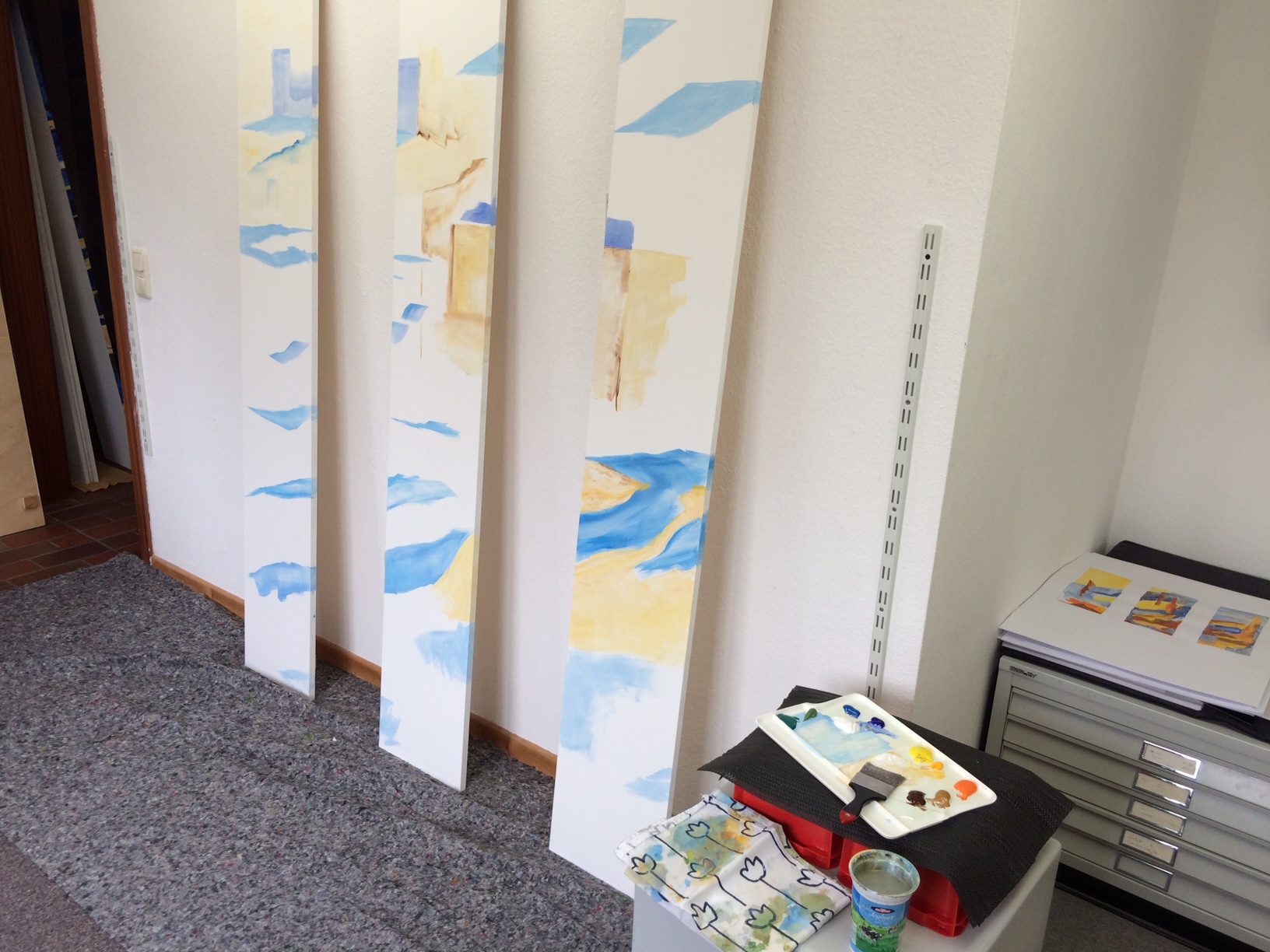 Ein neuer Anlauf mit einem alten Format: die Holztafeln 210 x 30 waren zu Beginn meiner Arbeit mit mehrteiligen Formaten einer meiner Standards. Eine Zeit lang haben sie sich verborgen, nun entsteht eine neue Arbeit, die man „mal eben an die Wand lehnen“ kann, ein Bild-Objekt. Ich bin gespannt!